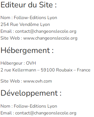 Le site www.changeonslecole.org est mis à jour régulièrement par Follow-Editions Lyon. De la même façon, les mentions légales peuvent être modifiées à tout moment : elles s’imposent néanmoins à l’utilisateur qui est invité à s’y référer le plus souvent possible afin d’en prendre connaissance.